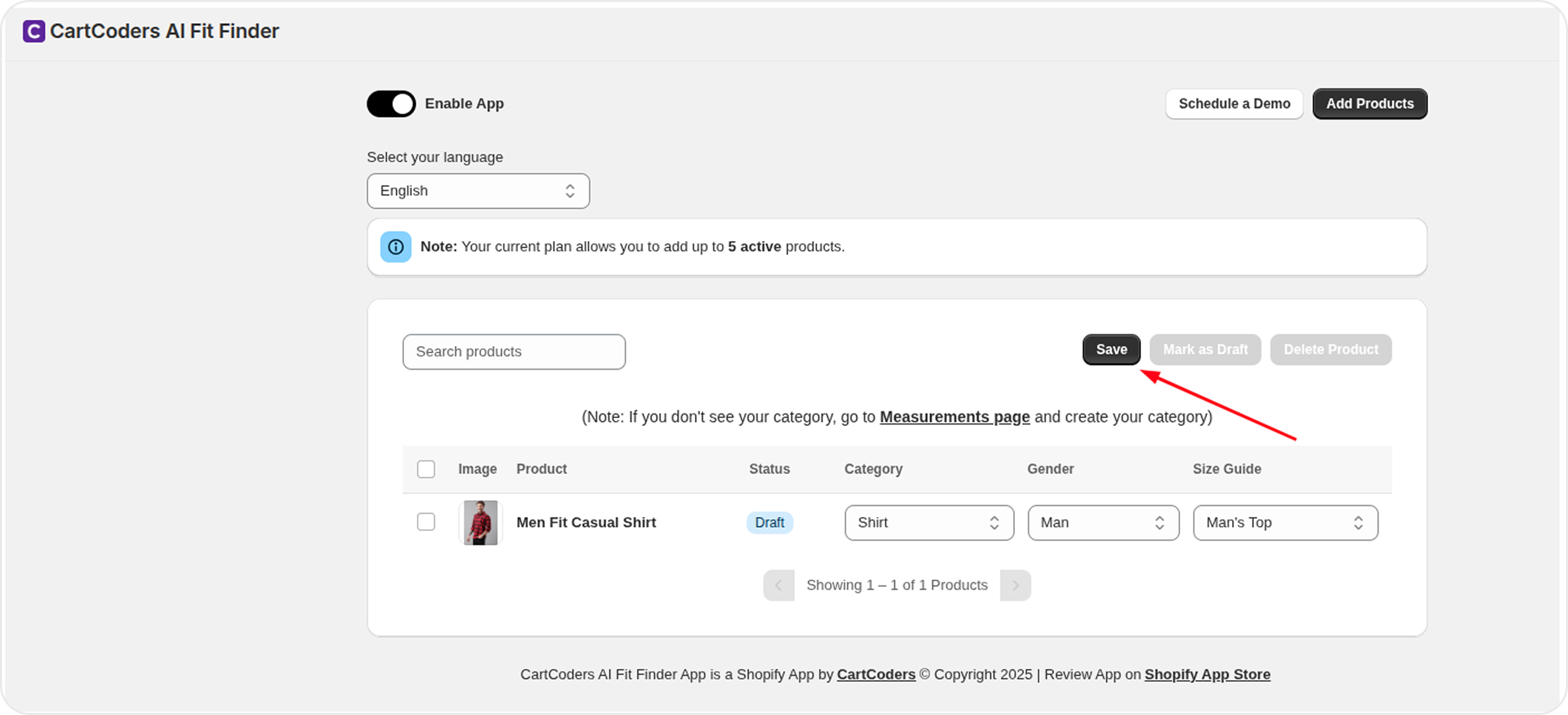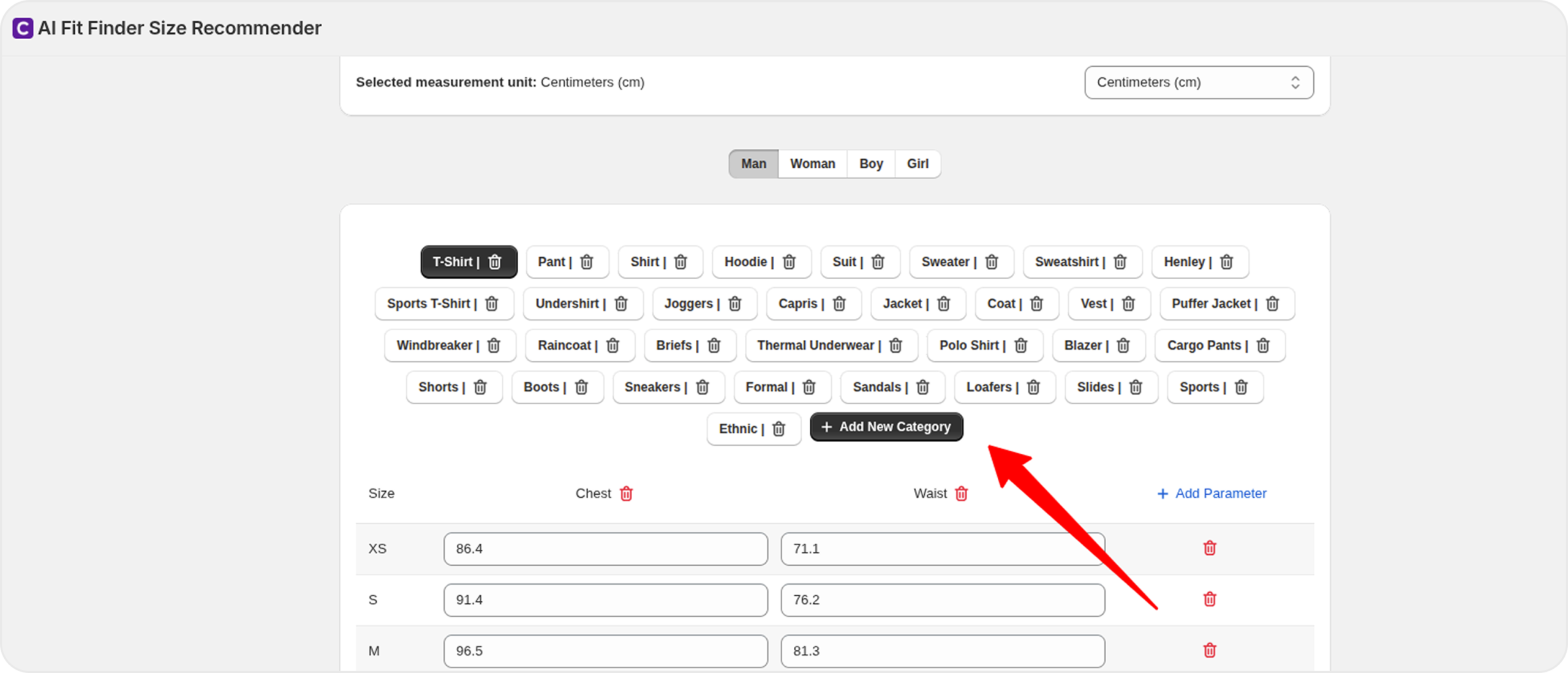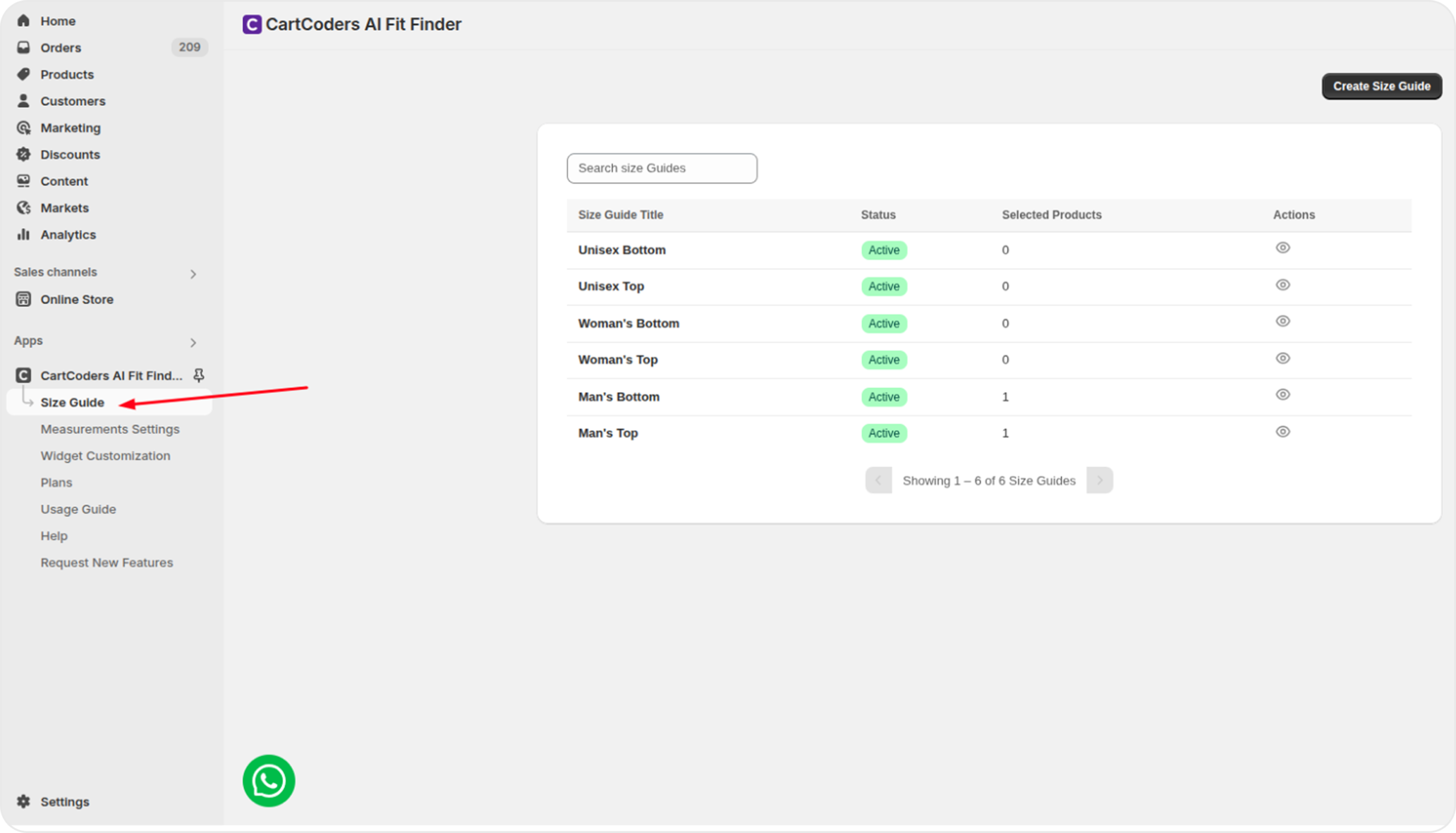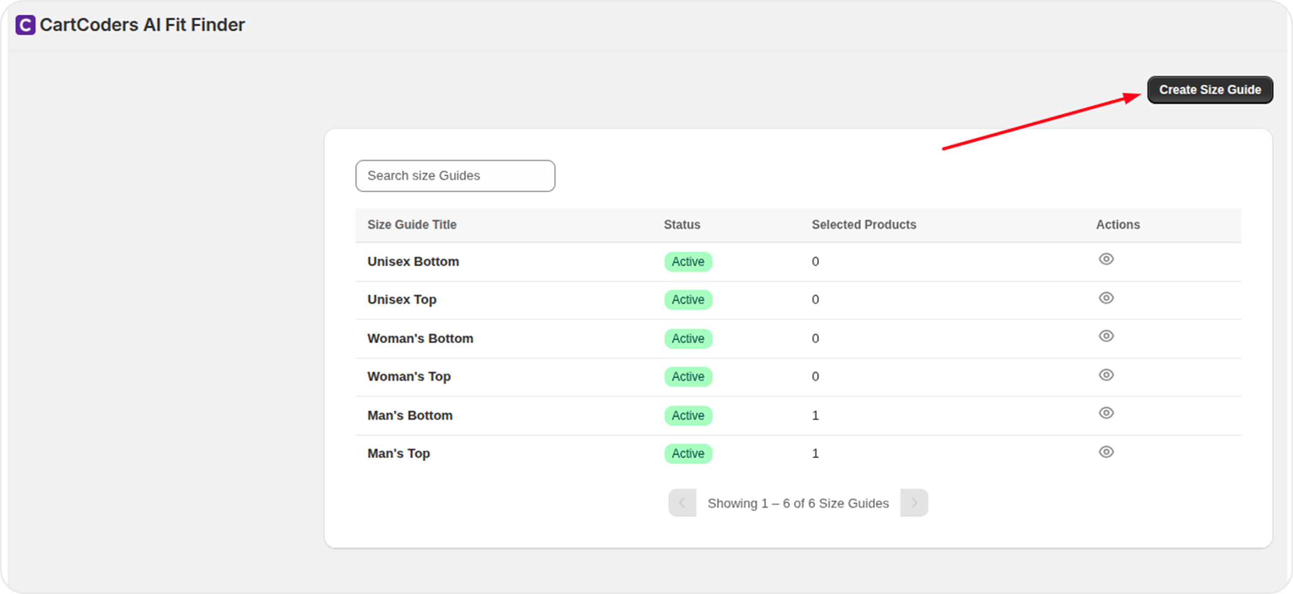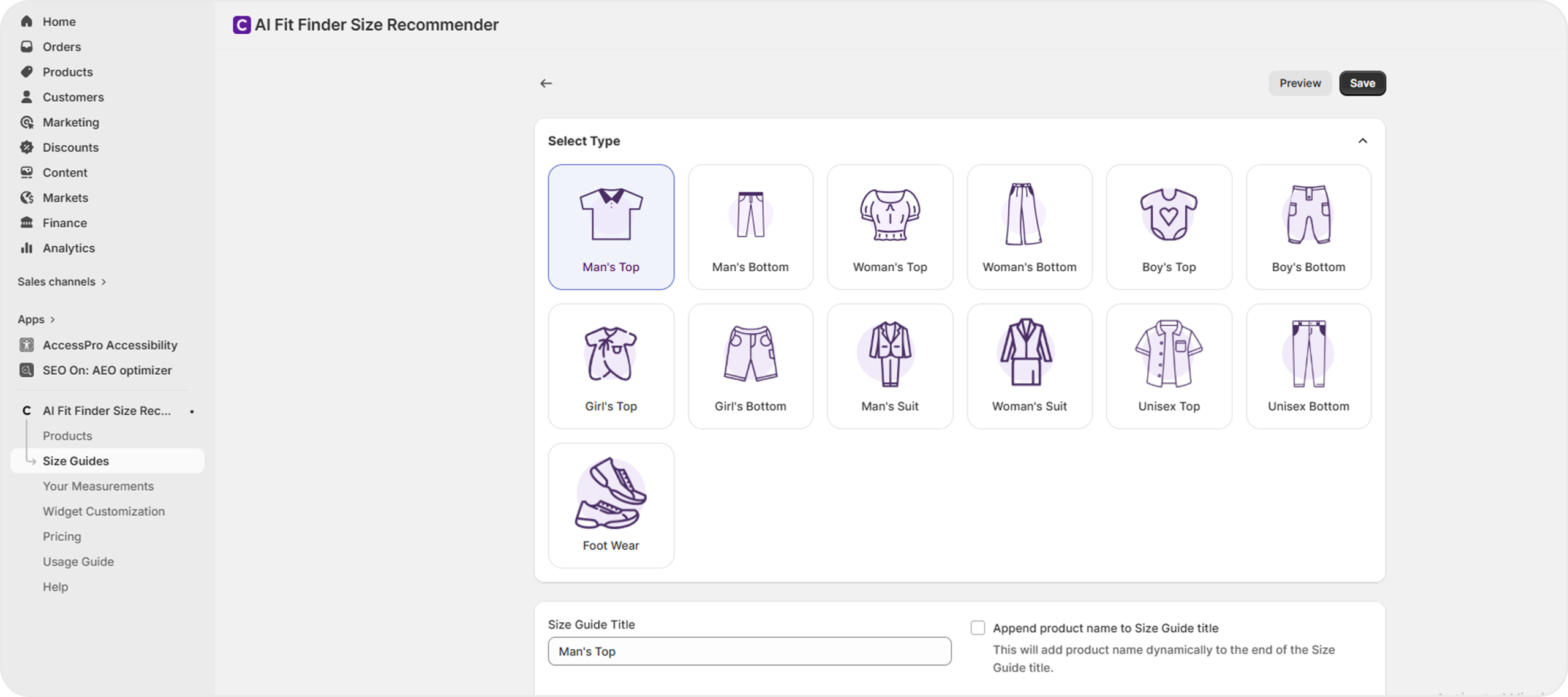 In your Shopify admin, open AI Fit Finder and navigate to the Size Guide tab from the app dashboard.